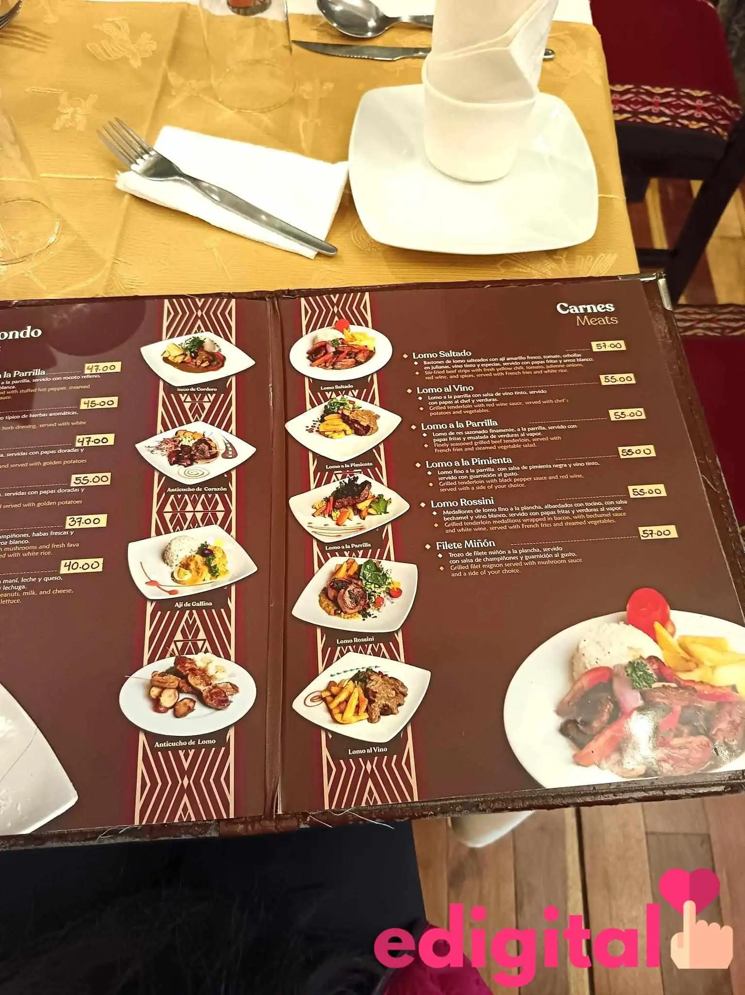 El menú de El Mesón de Don Tomás es extenso y ofrece una variedad de platos peruanos que incluyen el emblemático cuy al horno y el anticucho de alpaca. También tienen opciones para los menores, como un menú para niños, junto con deliciosos aperitivos y buen café. Para aquellos que buscan algo más ligero, ofrecen desayunos y almuerzos con opciones frescas.Bebidas y Postres